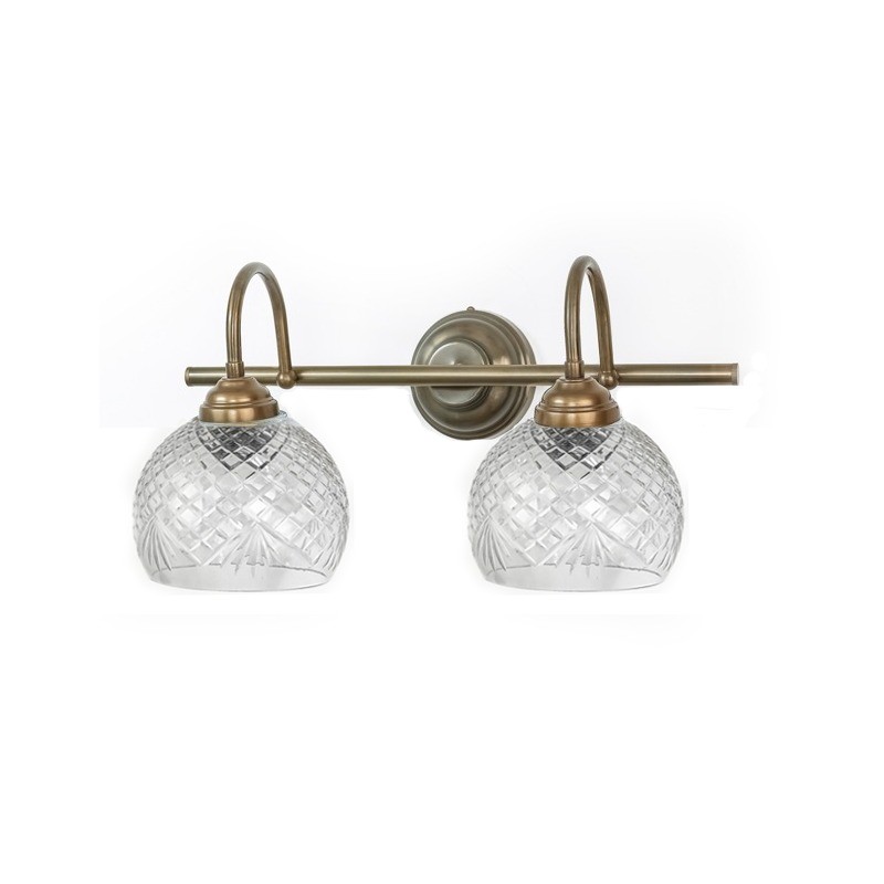 בעלת בסיס עגול בצבע ברונזה עליו מונח מוט וממנו מתפצלים שני אהילי זכוכית יפהפיים